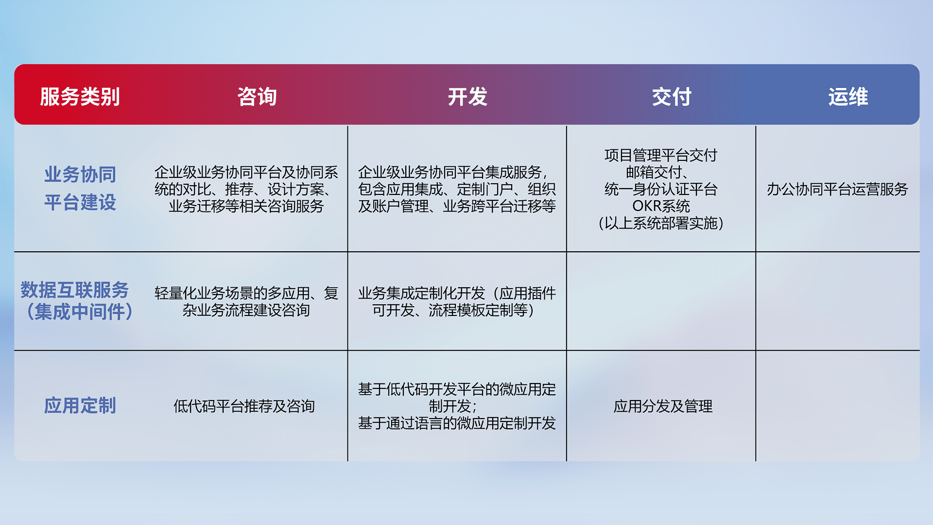 针对钉钉、、、企微、、、、IDaas等平台级产品提供产品的规划、、、方案、、、、交付、、、定制化开发等服务,,,,实现如统一协同办公、、智能客户服务、、、混合会议管理、、智能数据查询、、、等业务场景,,,实现数字化转型。。。。